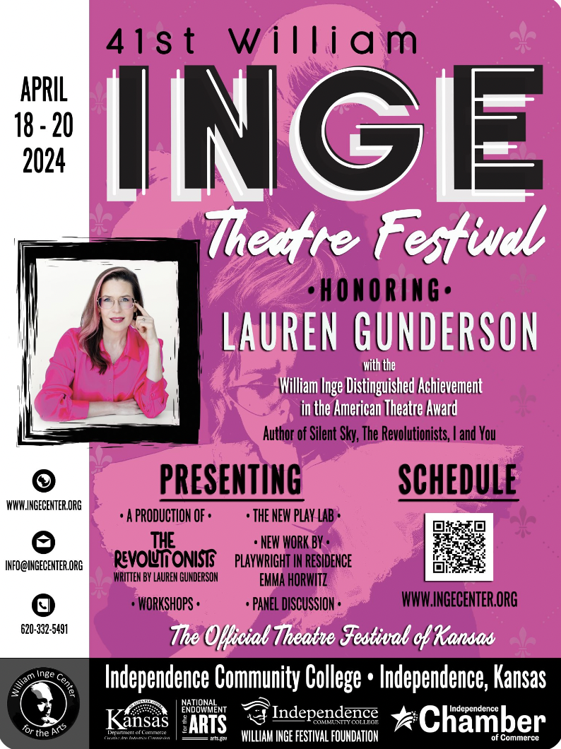 “The William Inge Center for the Arts at Independence Community College, Kansas, announces playwright Lauren Gunderson will be presented with the Distinguished Achievement in the American Theatre Award at the 41st annual William Inge Theatre Festival which will take place April 18th -20th 2024.”